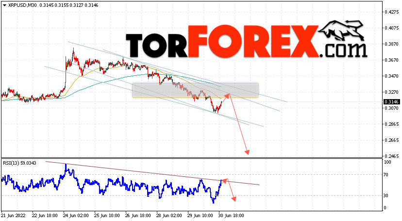 Таким образом, Криптовалюта XRP прогноз на 1 июля 2022 предполагает попытку теста уровня сопротивления вблизи области 0.3255. Откуда стоит ожидать продолжения падения криптовалюты с потенциальной целью на уровне 0.2465. Дополнительным сигналом в пользу снижения Ripple выступит тест нисходящей линии тренда на индикаторе относительной силы. Отменой варианта падения котировок станет сильный рост и пробой области 0.3565. В этом случае стоит ожидать продолжения подъёма по цифровой валюте с целью выше 0.4475.