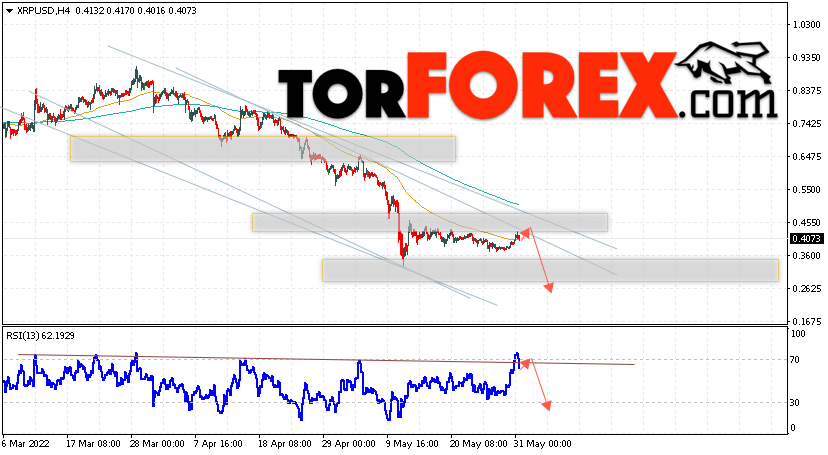 В пользу снижения котировок XRP/USD выступит тест линии сопротивления на индикаторе относительной силы. Вторым сигналом в пользу падения котировок актива станет отскок от верхней границы нисходящего канала. Отменой варианта падения криптовалюты станет сильный рост и закрытие котировок выше уровня 0.4855. Это укажет на пробой области сопротивления и продолжение роста XRP/USD в область выше уровня 0.5605. Подтверждением падению курса цифровой валюты выступит пробой области поддержки и закрытие цен под уровнем 0.3505, что укажет на пробой нижней границы нисходящего канала.