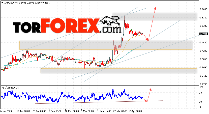 В пользу подъёма котировок XRP/USD выступит тест линии поддержки на индикаторе относительной силы. Вторым сигналом в пользу роста актива станет отскок от нижней границы бычьего канала. Отменой варианта роста криптовалюты станет падение и закрытие котировок ниже уровня 0.4275. Это укажет на пробой области поддержки и продолжение падения XRP/USD в область ниже уровня 0.3655. Подтверждением росту курса цифровой валюты выступит пробой области сопротивления и закрытие цен над уровнем 0.5355.
