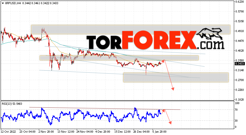 В пользу снижения котировок XRP/USD выступит тест линии сопротивления на индикаторе относительной силы. Вторым сигналом в пользу снижения актива станет отскок от верхней границы нисходящего канала. Отменой варианта падения криптовалюты станет сильный рост и закрытие котировок выше уровня 0.4045. Это укажет на пробой области сопротивления и продолжение роста XRP/USD в область выше уровня 0.4545. Подтверждением падению курса цифровой валюты выступит пробой области поддержки и закрытие цен под уровнем 0.3145.