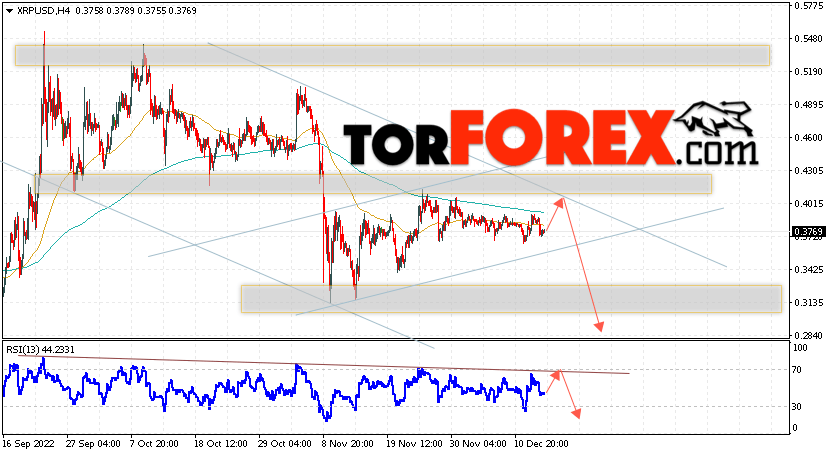 В пользу снижения котировок XRP/USD выступит тест линии сопротивления на индикаторе относительной силы. Вторым сигналом в пользу снижения актива станет отскок от верхней границы нисходящего канала. Отменой варианта падения криптовалюты станет сильный рост и закрытие котировок выше уровня 0.4425. Это укажет на пробой области сопротивления и продолжение роста XRP/USD в область выше уровня 0.5045. Подтверждением падению курса цифровой валюты выступит пробой области поддержки и закрытие цен под уровнем 0.3355, что укажет на пробой нижней границы бычьего канала коррекции.