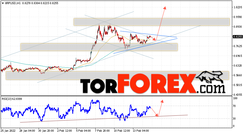В пользу подъёма котировок XRP/USD выступит тест линии поддержки на индикаторе относительной силы. Вторым сигналом в пользу роста котировок актива станет отскок от нижней границы бычьего канала. Отменой варианта подъёма криптовалюты станет падение и закрытие котировок ниже уровня 0.7205. Это укажет на пробой области поддержки и продолжение падения XRP/USD в область ниже уровня 0.6755. Подтверждением подъёму курса цифровой валюты выступит пробой области сопротивления и закрытие цен над уровнем 0.8505, что укажет на пробой верхней границы модели ”Треугольник”.