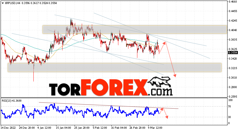 В пользу падения котировок XRP/USD выступит тест линии сопротивления на индикаторе относительной силы. Вторым сигналом в пользу падения актива станет отскок от верхней границы нисходящего канала. Отменой варианта падения криптовалюты станет сильный рост и закрытие котировок выше уровня 0.4145. Это укажет на пробой области сопротивления и продолжение подъёма XRP/USD в область выше уровня 0.4745. Подтверждением падению курса цифровой валюты выступит пробой области поддержки и закрытие цен под уровнем 0.3365.