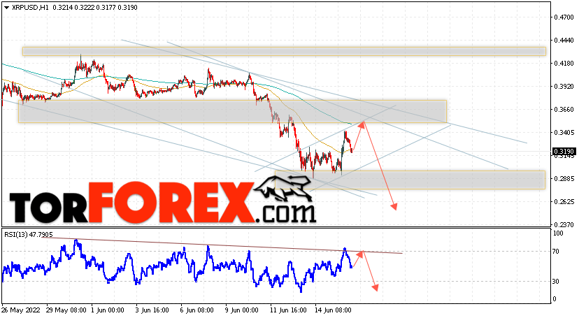 В пользу снижения котировок XRP/USD выступит тест линии сопротивления на индикаторе относительной силы. Вторым сигналом в пользу падения котировок актива станет отскок от верхней границы нисходящего канала. Отменой варианта падения криптовалюты станет сильный рост и закрытие котировок выше уровня 0.3755. Это укажет на пробой области сопротивления и продолжение роста XRP/USD в область выше уровня 0.4505. Подтверждением падению курса цифровой валюты выступит пробой области поддержки и закрытие цен под уровнем 0.2765, что укажет на пробой нижней границы бычьего канала.