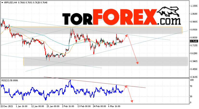 В пользу падения котировок XRP/USD выступит тест линии сопротивления на индикаторе относительной силы. Вторым сигналом в пользу снижения котировок актива станет отскок от верхней границы нисходящего канала. Отменой варианта падения криптовалюты станет сильный рост и закрытие котировок выше уровня 0.9105. Это укажет на пробой области сопротивления и продолжение роста XRP/USD в область выше уровня 0.9645. Подтверждением падению курса цифровой валюты выступит пробой области поддержки и закрытие цен под уровнем 0.6965.