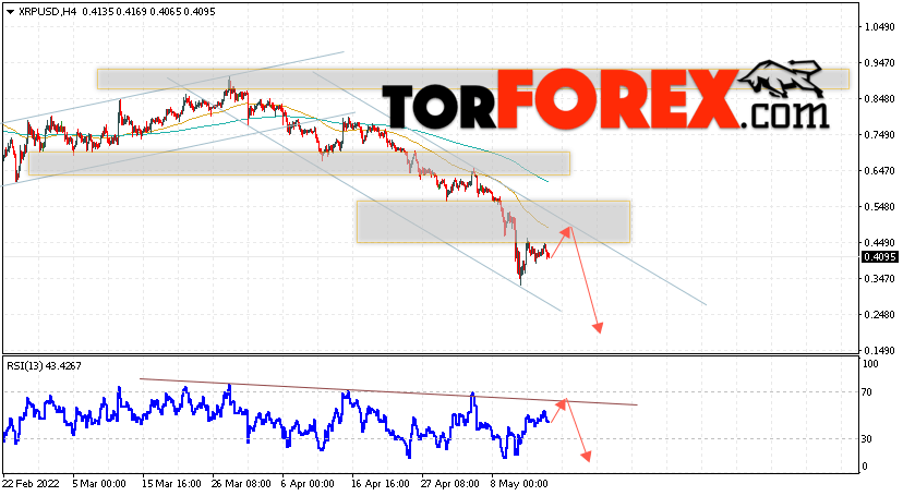 В пользу снижения котировок XRP/USD выступит тест линии сопротивления на индикаторе относительной силы. Вторым сигналом в пользу падения котировок актива станет отскок от верхней границы медвежьего канала. Отменой варианта падения криптовалюты станет сильный рост и закрытие котировок выше уровня 0.5605. Это укажет на пробой области сопротивления и продолжение роста XRP/USD в область выше уровня 0.6505. Подтверждением падению курса цифровой валюты выступит пробой области поддержки и закрытие цен под уровнем 0.3205.