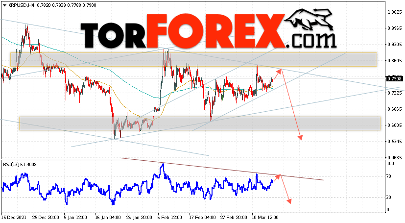 В пользу падения котировок XRP/USD выступит тест линии сопротивления на индикаторе относительной силы. Вторым сигналом в пользу снижения котировок актива станет отскок от верхней границы нисходящего канала. Отменой варианта падения криптовалюты станет сильный рост и закрытие котировок выше уровня 0.9105. Это укажет на пробой области сопротивления и продолжение роста XRP/USD в область выше уровня 0.9705. Подтверждением падению курса цифровой валюты выступит пробой области поддержки и закрытие цен под уровнем 0.6995, что укажите на пробой нижней границы бычьего канала.