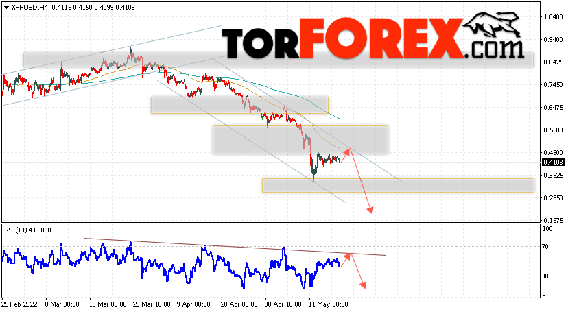 В пользу снижения котировок XRP/USD выступит тест линии сопротивления на индикаторе относительной силы. Вторым сигналом в пользу падения котировок актива станет отскок от верхней границы медвежьего канала. Отменой варианта падения криптовалюты станет сильный рост и закрытие котировок выше уровня 0.4865. Это укажет на пробой области сопротивления и продолжение роста XRP/USD в область выше уровня 0.6005. Подтверждением падению курса цифровой валюты выступит пробой области поддержки и закрытие цен под уровнем 0.3455.