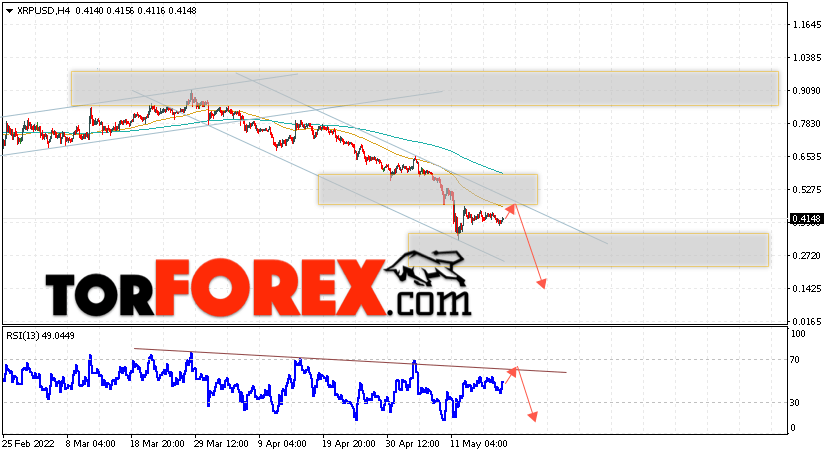 В пользу снижения котировок XRP/USD выступит тест линии сопротивления на индикаторе относительной силы. Вторым сигналом в пользу падения котировок актива станет отскок от верхней границы медвежьего канала. Отменой варианта падения криптовалюты станет сильный рост и закрытие котировок выше уровня 0.4995. Это укажет на пробой области сопротивления и продолжение роста XRP/USD в область выше уровня 0.5505. Подтверждением падению курса цифровой валюты выступит пробой области поддержки и закрытие цен под уровнем 0.3605.