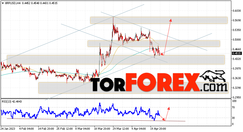 Таким образом, Криптовалюта XRP прогноз на 25 апреля 2023 предполагает попытку теста уровня поддержки вблизи области 0.4465. Откуда стоит ожидать продолжения роста криптовалюты с потенциальной целью на уровне 0.5685. Дополнительным сигналом в пользу подъёма Ripple выступит тест линии сопротивления на индикаторе относительной силы. Отменой варианта роста котировок станет падение и пробой области 0.4125. В этом случае стоит ожидать продолжения снижения по цифровой валюте с целью ниже 0.3745.