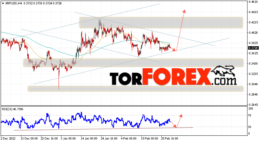 В пользу роста котировок XRP/USD выступит тест линии поддержки на индикаторе относительной силы. Вторым сигналом в пользу роста актива станет отскок от нижней границы бычьего канала. Отменой варианта роста криптовалюты станет падение и закрытие котировок ниже уровня 0.3355. Это укажет на пробой области поддержки и продолжение падения XRP/USD в область ниже уровня 0.2855. Подтверждением росту курса цифровой валюты выступит пробой области сопротивления и закрытие цен над уровнем 0.4105, что укажет на пробой верхней границы нисходящего канала.