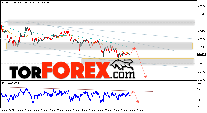 Таким образом, Криптовалюта XRP прогноз на 30 мая 2022 предполагает попытку теста уровня сопротивления вблизи области 0.3945. Откуда стоит ожидать продолжения падения криптовалюты с потенциальной целью на уровне 0.3345. Дополнительным сигналом в пользу снижения Ripple выступит тест нисходящей линии тренда на индикаторе относительной силы. Отменой варианта падения котировок станет сильный рост и пробой области 0.4255. В этом случае стоит ожидать продолжения подъёма по цифровой валюте с целью выше 0.5205.