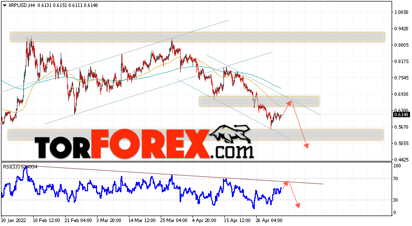 В пользу снижения котировок XRP/USD выступит тест линии сопротивления на индикаторе относительной силы. Вторым сигналом в пользу падения котировок актива станет отскок от верхней границы медвежьего канала. Отменой варианта падения криптовалюты станет сильный рост и закрытие котировок выше уровня 0.7305. Это укажет на пробой области сопротивления и продолжение роста XRP/USD в область выше уровня 0.7965. Подтверждением падению курса цифровой валюты выступит пробой области поддержки и закрытие цен под уровнем 0.5205.