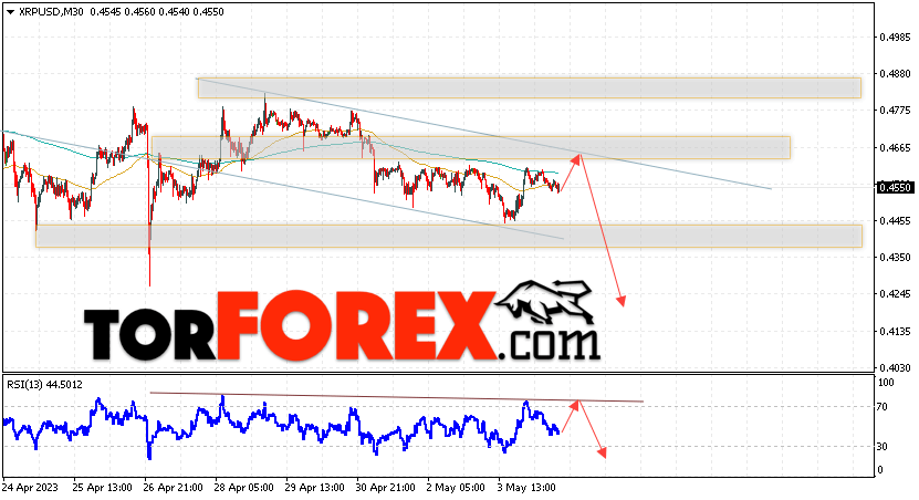 Таким образом, Криптовалюта XRP прогноз на 5 мая 2023 предполагает попытку теста уровня сопротивления вблизи области 0.4675. Откуда стоит ожидать продолжения падения криптовалюты с потенциальной целью на уровне 0.4245. Дополнительным сигналом в пользу снижения Ripple выступит тест линии сопротивления на индикаторе относительной силы. Отменой варианта падения котировок станет сильный рост и пробой области 0.4705. В этом случае стоит ожидать продолжения подъёма по цифровой валюте с целью выше 0.5445.