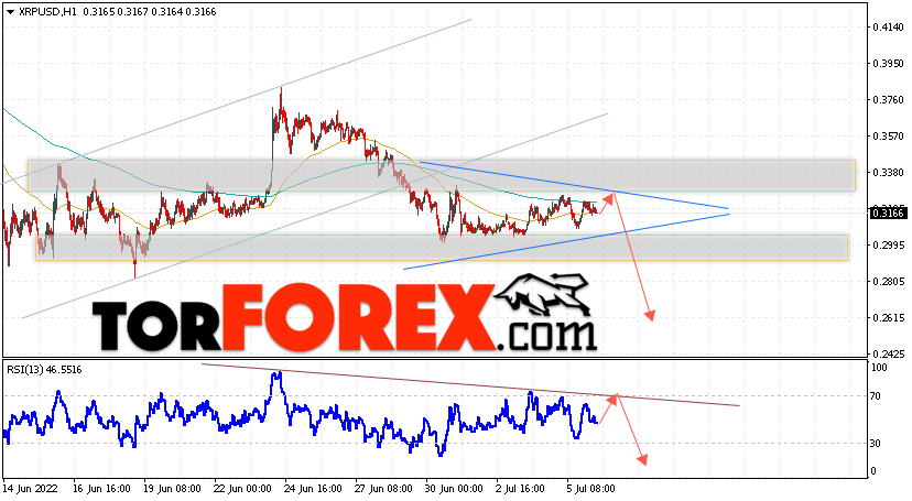 Котировки XRP/USD торгуются на уровне 0.3166 и продолжают движение в рамках падения и формирования модели ”Треугольник”. Капитализация криптовалюты Ripple в момент публикации прогноза составляет $15,636,783,412. Скользящие средние указывают на наличие краткосрочной медвежьей тенденции по Ripple. Цены вновь тестируют область между сигнальными линиями, что указывает на давление со стороны продавцов актива и потенциальное продолжение снижения курса XRP на рынке уже с текущих уровней. На данный момент стоит ожидать попытку развития коррекции актива и тест уровня сопротивления вблизи области 0.3195. Далее, отскок вниз и продолжение падения криптовалюты в область ниже уровня 0.2605.
