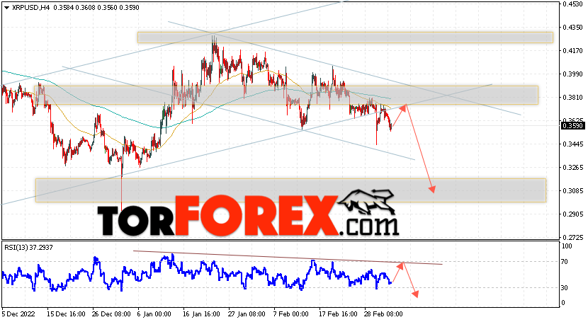 В пользу снижения котировок XRP/USD выступит тест линии сопротивления на индикаторе относительной силы. Вторым сигналом в пользу снижения актива станет отскок от нижней границы бычьего канала, который был пробит продавцами вниз. Отменой варианта снижения криптовалюты станет сильный рост и закрытие котировок выше уровня 0.4165. Это укажет на пробой области сопротивления и продолжение роста XRP/USD в область выше уровня 0.4975. Подтверждением падению курса цифровой валюты выступит пробой области поддержки и закрытие цен под уровнем 0.3305.