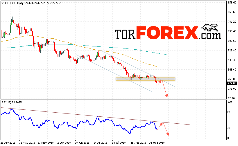 В пользу снижения котировок ETH/USD на текущей торговой недели 10 — 14 сентября 2018 выступит тест линии сопротивления на индикаторе относительной силы, а также тест верхней границы нисходящего канала. Отменой варианта падения станет сильный рост и пробой уровня 310, что укажет на пробой верхней границы канала и продолжение роста ETH/USD с целю все уровня 425. Подтверждением снижения криптовалюты Ethereum выступит пробой области поддержки и закрытие котировок ниже уровня 165.