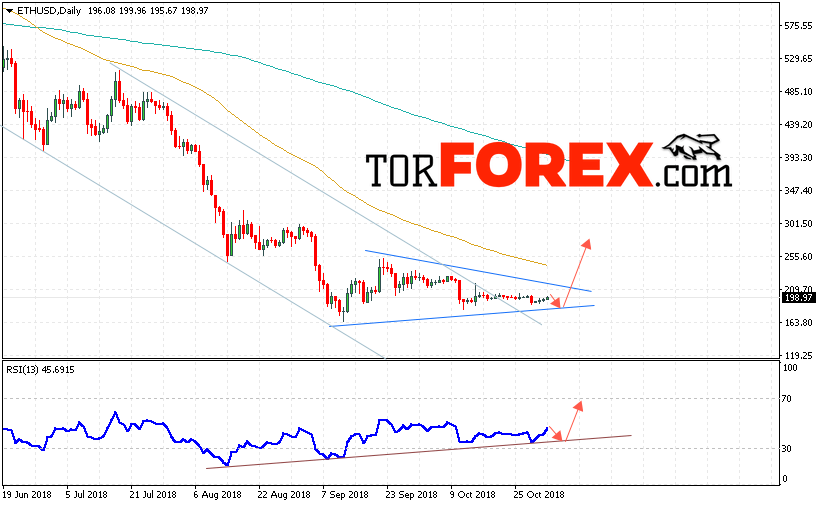 В пользу роста котировок ETH/USD на текущей торговой недели 5 — 9 ноября 2018 выступит тест линии тренда на индикаторе относительной силы. Отменой варианта роста станет падение и пробой уровня 165, что укажет на пробой границы модели и продолжение снижения ETH/USD с потенциальной целью ниже уровня 110. Подтверждением роста криптовалюты Ethereum выступит пробой верхней границы модели «Треугольник» и закрытие котировок выше уровня 225.
