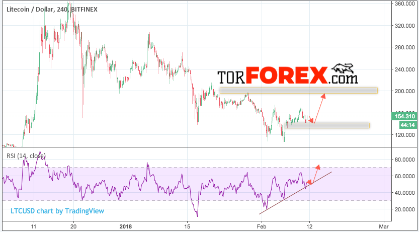 Таким образом, Litecoin прогноз и аналитика на 12 февраля 2018 предполагает попытку теста уровня 150, откуда стоит ожидать отскок и продолжения роста в область выше уровня 200, дополнительным сигналом в пользу падения Litecoin выступит тест линии тренда на индикаторе относительной силы.