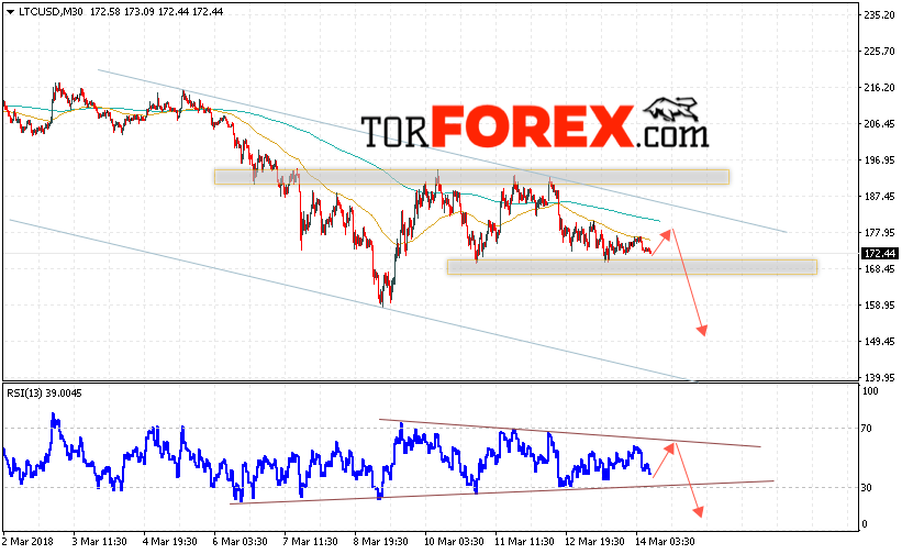 Таким образом, Litecoin прогноз и аналитика на 15 марта 2018 предполагает попытку теста области сопротивления вблизи уровня 175, откуда стоит ожидать отскок и продолжения падения в область ниже уровня 150, дополнительным сигналом в пользу падения Litecoin выступит тест линии тренда на индикаторе относительной силы, отменой варианта падения станет сильный рост и пробой области 195.