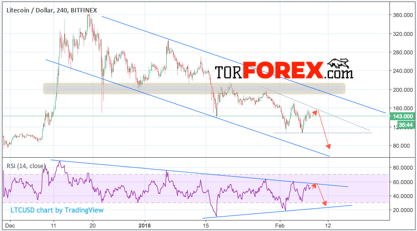 Таким образом, Litecoin прогноз и аналитика на 9 февраля 2018 предполагает попытку теста уровня 145, откуда стоит ожидать отскок и продолжения падения в область ниже уровня 85, дополнительным сигналом в пользу падения Litecoin выступит тест линии сопротивления на индикаторе относительной силы.