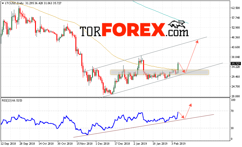 В пользу подъёма котировок LTC/USD на текущей торговой неделе 11 — 15 февраля 2019 выступит тест линии поддержки на индикаторе относительной силы. А также отскок от нижней границы восходящего канала. Отменой варианта роста Litecoin станет падениеи пробой области 27.50. Это укажет на пробой нижней границы канала и продолжение снижения LTC/USD. Подтверждением роста криптовалюты выступит пробой области сопротивления и закрытие котировок выше уровня 39.50.
