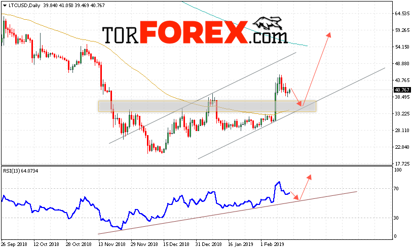 В пользу подъёма котировок LTC/USD на текущей торговой неделе 18 — 22 февраля 2019 выступит тест линии поддержки на индикаторе относительной силы. А также отскок от нижней границы восходящего канала. Отменой варианта роста Litecoin станет падениеи пробой области 31.50. Это укажет на пробой нижней границы канала и продолжение снижения LTC/USD. Подтверждением роста криптовалюты выступит пробой области сопротивления и закрытие котировок выше уровня 45.50.