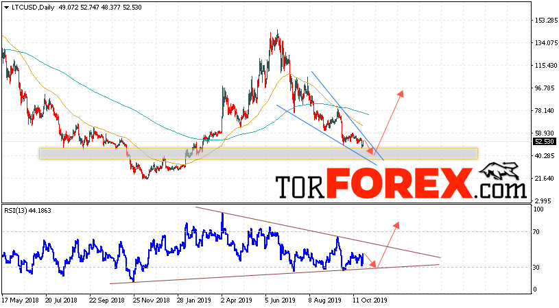 Дополнительным сигналом в пользу роста котировок LTC/USD на текущей торговой неделе 28 октября — 1 ноября 2019 выступит тест восходящей линии тренда на индикаторе относительной силы. Вторым сигналом станет отскок от нижней границы модели «Треугольник». Отменой варианта роста Litecoin станет падение и пробой области 35.00. Это укажет на пробой нижней границы модели и продолжение падения курса LTC/USD. Подтверждением роста криптовалюты выступит пробой верхней границы модели «Клин» и закрытие котировок выше уровня 55.05.