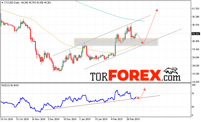В пользу подъёма котировок LTC/USD на текущей торговой неделе 4 — 8 марта 2019 выступит тест линии поддержки на индикаторе относительной силы. А также отскок от нижней границы восходящего канала. Отменой варианта роста Litecoin станет падение и пробой области 35.00. Это укажет на пробой нижней границы канала и продолжение снижения LTC/USD. Подтверждением роста криптовалюты выступит пробой области сопротивления и закрытие котировок выше уровня 51.50.