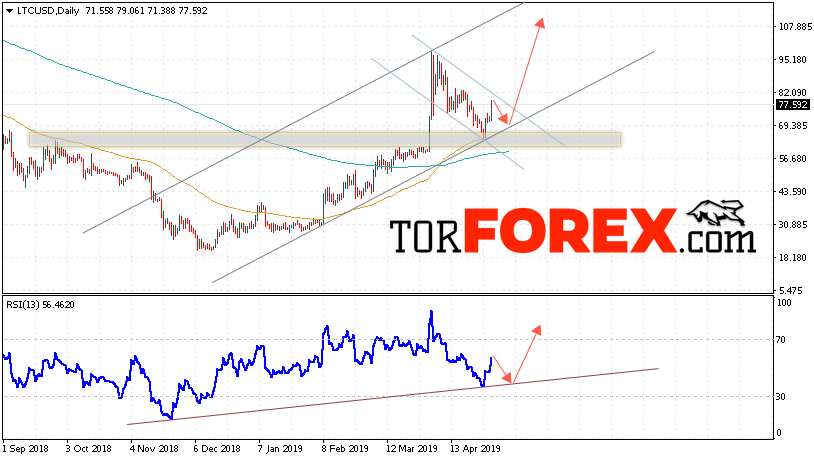 Дополнительным сигналом в пользу роста котировок LTC/USD на текущей торговой неделе 6 — 10 мая 2019 выступит тест линии поддержки на индикаторе относительной силы. Вторым сигналом станет также отскок от нижней границы восходящего канала. Отменой варианта снижения Litecoin станет сильный рост и пробой области 56.65. Это укажет на пробой нижней границы канала и продолжение падения LTC/USD. Подтверждением роста криптовалюты выступит пробой верхней границы нисходящего канала и закрытие котировок выше уровня 84.55.