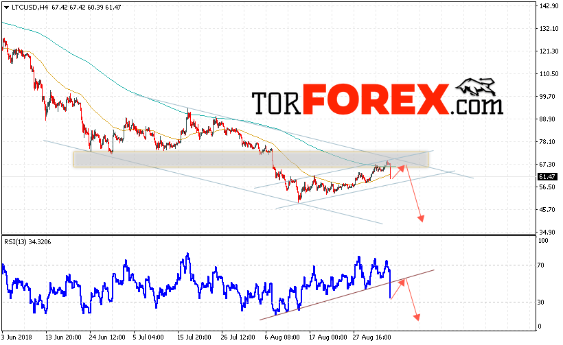 В пользу падения котировок LTC/USD выступит тест восходящей линии тренда на индикаторе относительной силы, а также тест верхней границы нисходящего канала. Отменой варианта снижения станет сильный рост и пробой области 70.00, что укажет на пробой верхней границы канала и продолжения роста курса криптовалюты. С пробоем нижней границы восходящего канала и закрытием котировок ниже уровня 55.00 стоит ожидать подтверждения развития нисходящей тенденции по Litecoin.