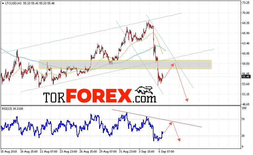 В пользу падения котировок LTC/USD выступит тест линии тренда на индикаторе относительной силы, а также тест верхней границы нисходящего канала. Отменой варианта снижения станет сильный рост и пробой области 61.00, что укажет на пробой верхней границы канала и продолжения роста курса криптовалюты. С пробоем области поддержки и закрытием котировок ниже уровня 52.00 стоит ожидать подтверждения развития нисходящей тенденции по Litecoin.