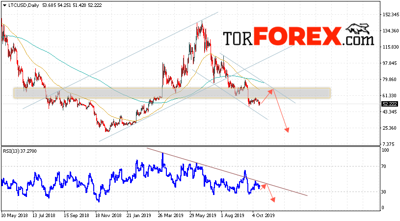 Дополнительным сигналом в пользу падения котировок LTC/USD на текущей торговой неделе 21 — 25 октября 2019 выступит тест нисходящей линии тренда на индикаторе относительной силы. Вторым сигналом станет отскок от верхней границы нисходящего канала. Отменой варианта падения Litecoin станет сильный рост и пробой области 78.55. Это укажет на пробой верхней границы канала и продолжение роста курса LTC/USD. Подтверждением падения криптовалюты выступит пробой области поддержки и закрытие котировок ниже уровня 42.25.