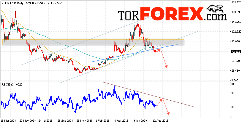 Дополнительным сигналом в пользу падения котировок LTC/USD на текущей торговой неделе 26 — 30 августа 2019 выступит тест нисходящей линии тренда на индикаторе относительной силы. Вторым сигналом станет отскок от нижней границы восходящего канала. Отменой варианта падения Litecoin станет сильный рост и пробой области 110.00. Это укажет на пробой области сопротивления и продолжение роста LTC/USD. Подтверждением падения криптовалюты выступит пробой области поддержки и закрытие котировок ниже уровня 65.00.