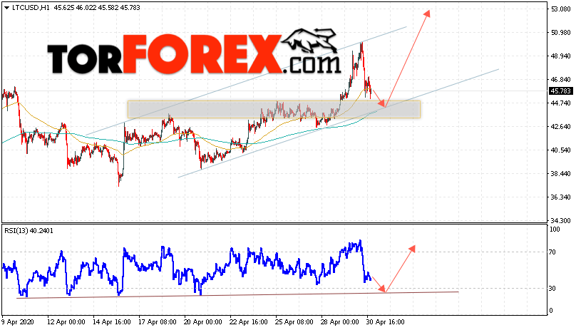В пользу подъёма котировок LTC/USD выступит тест линии поддержки на индикаторе относительной силы. Вторым сигналом станет отскок от нижней границы восходящего канала. Отменой варианта роста станет падение и пробой области 40.05. Это укажет на пробой области поддержки и ускорение падения курса криптовалюты с потенциальной целью ниже уровня 30.05. С пробоем области сопротивления и закрытием котировок выше уровня 50.55 стоит ожидать подтверждения развития восходящей тенденции по Litecoin.