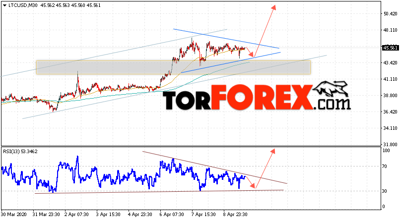 В пользу роста котировок LTC/USD выступит тест линии поддержки на индикаторе относительной силы. Вторым сигналом станет отскок от нижней границы восходящего канала. Отменой варианта роста станет падение и пробой области 39.55. Это укажет на пробой области поддержки и ускорение падения курса криптовалюты с потенциальной целью ниже уровня 30.05. С пробоем области сопротивления и закрытием котировок выше уровня 49.05 стоит ожидать подтверждения развития восходящей тенденции по Litecoin и начало отработки модели «Треугольник».