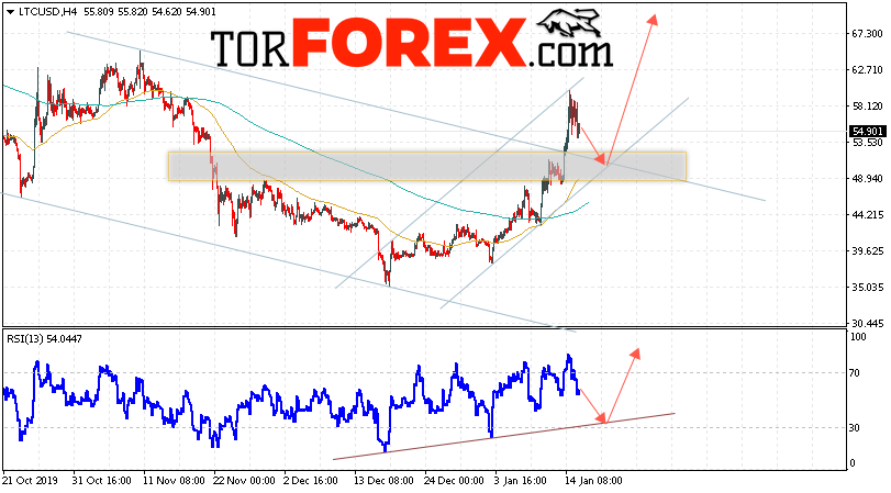В пользу роста котировок LTC/USD выступит тест восходящей линии тренда на индикаторе относительной силы. Вторым сигналом станет отскок от нижней границы восходящего канала. Отменой варианта роста станет падение и пробой области 45.05. Это укажет на пробой области поддержки и ускорение падения курса криптовалюты с потенциальной целью ниже уровня 35.05. С пробоем области сопротивления и закрытием котировок выше уровня 62.05 стоит ожидать подтверждения развития восходящей тенденции по Litecoin.