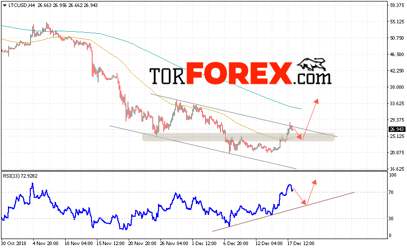 Таким образом, Litecoin прогноз курса криптовалют на 19 декабря 2018 предполагает попытку теста области поддержки вблизи уровня 25.50. Откуда стоит ожидать отскок и продолжения роста LTC/USD в область выше уровня 34.00. Дополнительным сигналом в пользу роста Litecoin выступит тест линии тренда на индикаторе относительной силы. Отменой варианта роста станет падение и пробой области 22.50. Это укажет на продолжение снижения криптовалюты.