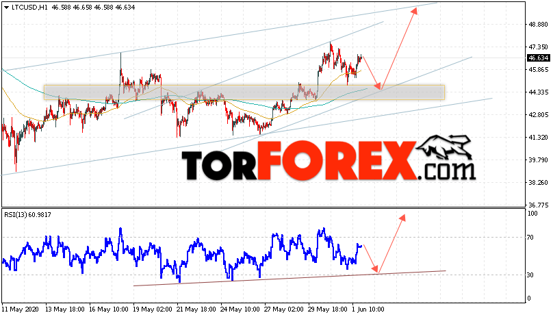 В пользу роста котировок LTC/USD выступит тест линии поддержки на индикаторе относительной силы. Вторым сигналом станет отскок от нижней границы восходящего канала. Отменой варианта роста станет падение и пробой области 42.05. Это укажет на пробой области поддержки и ускорение падения курса криптовалюты с потенциальной целью ниже уровня 35.05. С пробоем области сопротивления и закрытием котировок выше уровня 50.05 стоит ожидать подтверждения развития восходящей тенденции по Litecoin.