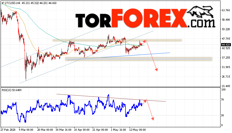 В пользу падения котировок LTC/USD выступит тест линии поддержки на индикаторе относительной силы. Вторым сигналом станет завершение формирования разворотной модели «Голова и плечи». Отменой варианта снижения станет сильный рост и пробой области 52.05. Это укажет на пробой области сопротивления и ускорение роста курса криптовалюты с потенциальной целью выше уровня 65.05. С пробоем области поддержки и закрытием котировок ниже уровня 38.05 стоит ожидать подтверждения развития нисходящей тенденции по Litecoin.