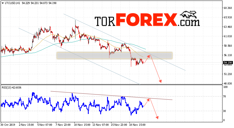 В пользу падения котировок LTC/USD выступит тест нисходящей линии тренда на индикаторе относительной силы. Вторым сигналом станет отскок от верхней границы нисходящего канала. Отменой варианта падения станет сильный рост и пробой области 57.25. Это укажет на пробой области сопротивления и ускорение роста курса криптовалюты с потенциальной целью выше уровня 65.65. С пробоем области поддержки и закрытием котировок ниже уровня 51.55 стоит ожидать подтверждения развития медвежьей тенденции по Litecoin.