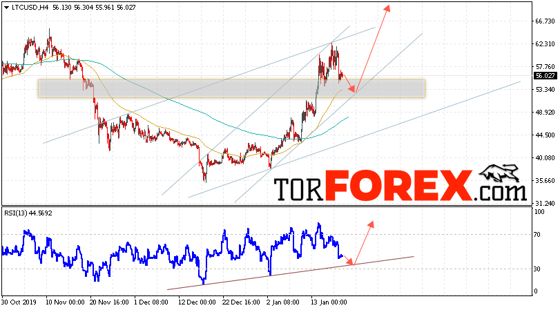 В пользу роста котировок LTC/USD выступит тест восходящей линии тренда на индикаторе относительной силы. Вторым сигналом станет отскок от нижней границы восходящего канала. Отменой варианта роста станет падение и пробой области 46.05. Это укажет на пробой области поддержки и ускорение падения курса криптовалюты с потенциальной целью ниже уровня 35.05. С пробоем области сопротивления и закрытием котировок выше уровня 63.05 стоит ожидать подтверждения развития восходящей тенденции по Litecoin.