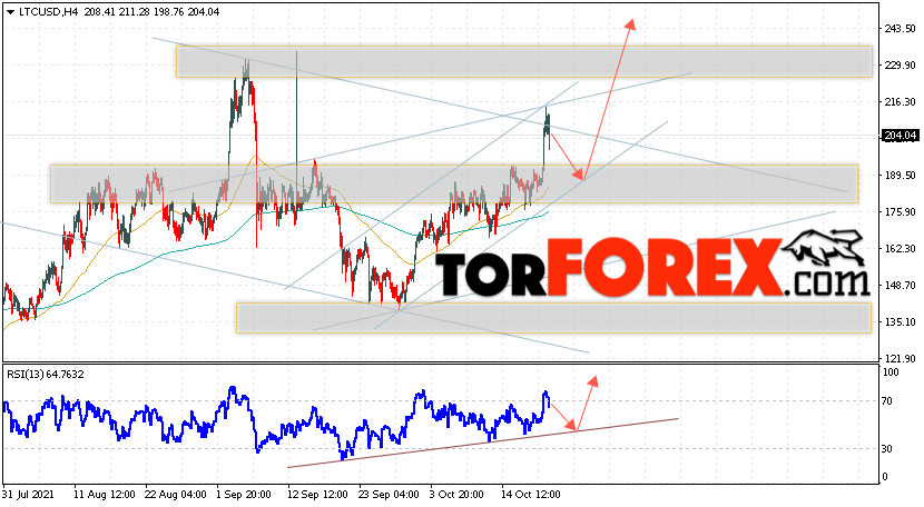 Дополнительным сигналом в пользу роста котировок LTC/USD выступит тест бычьей линии тренда на индикаторе относительной силы. Вторым сигналом станет отскок от нижней границы восходящего канала. Отменой варианта подъёма монеты станет падение стоимости актива и пробой области 170.55. Это укажет на пробой области поддержки и продолжение падения курса криптовалюты с потенциальной целью ниже уровня 135.55. С пробоем области сопротивления и закрытием котировок выше уровня 220.05 стоит ожидать подтверждения развития бычьей тенденции по Litecoin, что укажет на пробой верхней границы нисходящего канала.