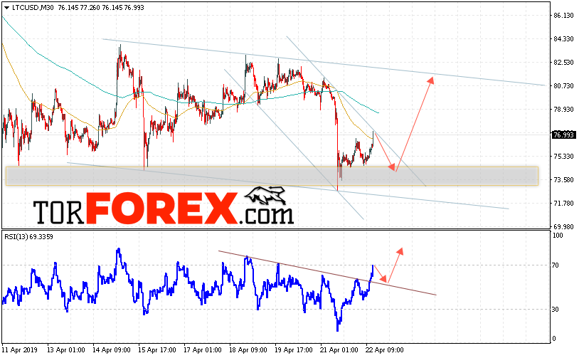 В пользу подъёма котировок LTC/USD выступит тест пробитой линии тренда на индикаторе относительной силы. Вторым сигналом станет отскок от нижней границы нисходящего канала. Отменой варианта роста станет падение и пробой области 71.05. Это укажет на пробой области поддержки и продолжения падения курса криптовалюты. С пробоем верхней границы нисходящего канала и закрытием котировок выше области 78.65 стоит ожидать подтверждения развития восходящей тенденции по Litecoin.