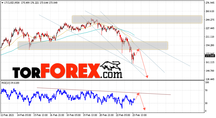 В пользу снижения котировок LTC/USD выступит тест линии нисходящей тренда на индикаторе относительной силы. Вторым сигналом станет отскок от верхней границы медвежьего канала. Отменой варианта падения станет сильный рост стоимости актива и пробой области 210.05. Это укажет на пробой области сопротивления и ускорение подъёма курса криптовалюты с потенциальной целью выше уровня 245.05. С пробоем области поддержки и закрытием котировок ниже уровня 155.05 стоит ожидать подтверждения развития медвежий тенденции по Litecoin.