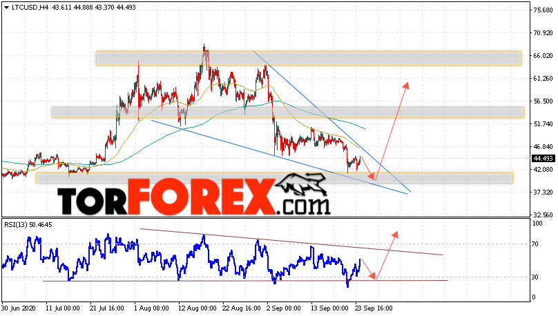 В пользу подъёма котировок LTC/USD выступит тест линии поддержки на индикаторе относительной силы. Вторым сигналом станет отскок от нижней границы модели ”Клин”. Отменой варианта роста станет падение и пробой области 35.55. Это укажет на пробой области поддержки и ускорение падения курса криптовалюты с потенциальной целью ниже уровня 30.05. С пробоем области сопротивления и закрытием котировок выше уровня 48.55 стоит ожидать подтверждения развития восходящей тенденции по Litecoin, что также укажет на пробой верхней границы разворотной модели.