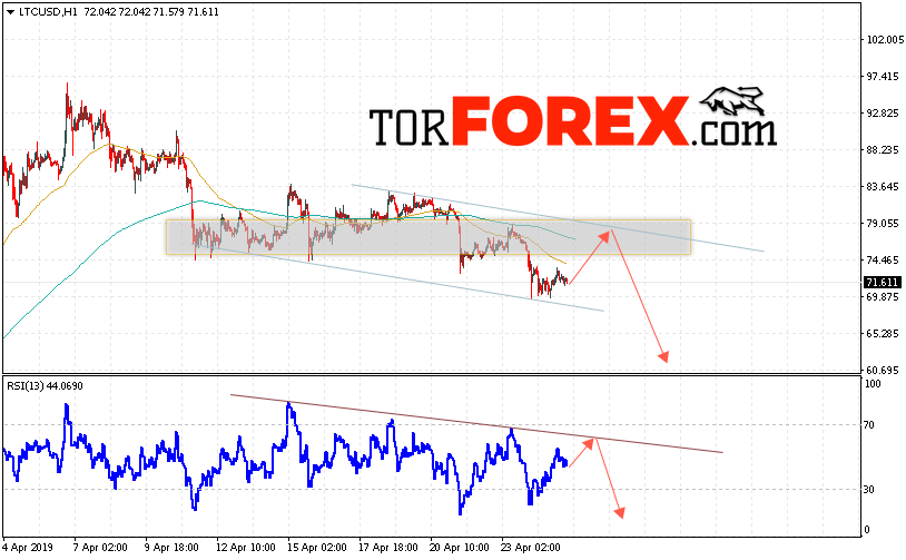Таким образом, Litecoin прогноз курса криптовалют на 26 апреля 2019 предполагает попытку теста области сопротивления вблизи уровня 79.00. Откуда стоит ожидать отскок и продолжения падения LTC/USD в область ниже уровня 60.65. Дополнительным сигналом в пользу падения Litecoin выступит тест линии тренда на индикаторе относительной силы. Отменой варианта падения станет сильный рост и пробой области 82.55. Это укажет на продолжение подъёма криптовалюты.