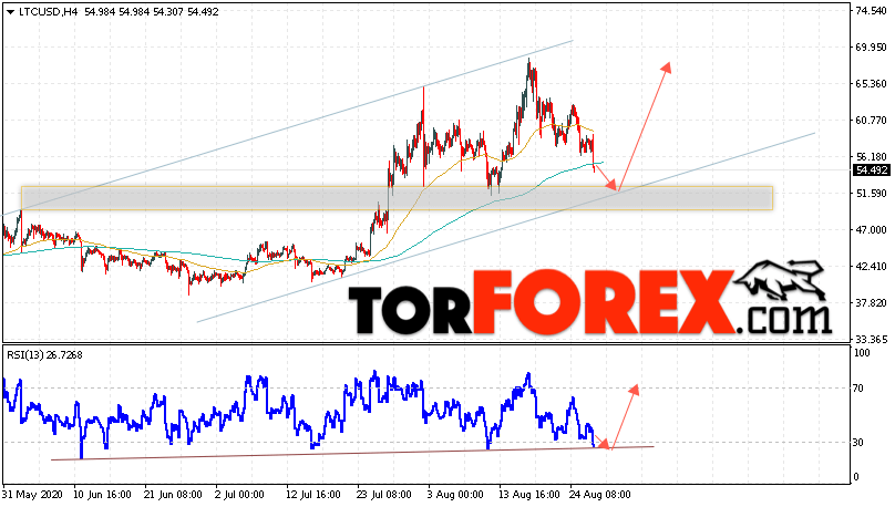 В пользу подъёма котировок LTC/USD выступит тест линии поддержки на индикаторе относительной силы. Вторым сигналом станет отскок от нижней границы восходящего канала. Отменой варианта роста станет падение и пробой области 47.05. Это укажет на пробой области поддержки и ускорение падения курса криптовалюты с потенциальной целью ниже уровня 40.05. С пробоем области сопротивления и закрытием котировок выше уровня 62.55 стоит ожидать подтверждения развития восходящей тенденции по Litecoin.