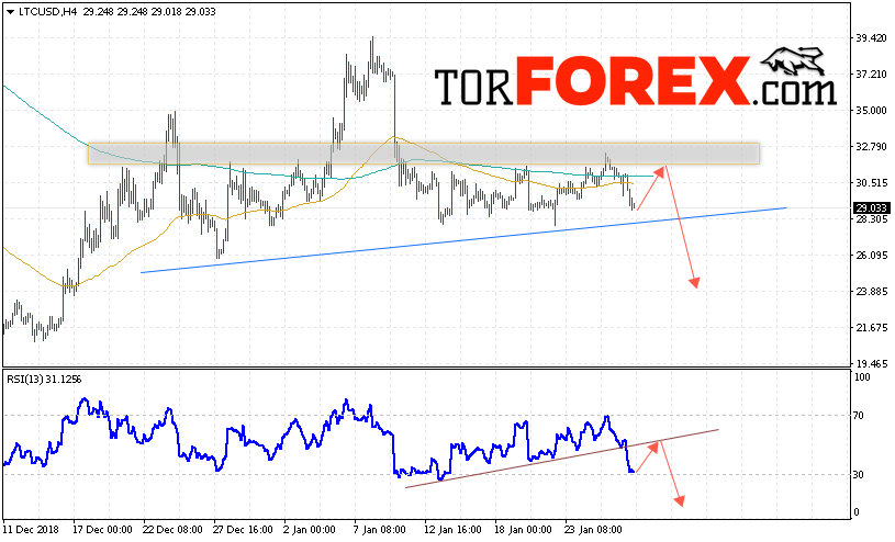 В пользу снижения котировок LTC/USD выступит тест нисходящей линии тренда на индикаторе относительной силы. Отменой варианта падения станет сильный рост и пробой области 34.50. Это укажет на пробой сопротивления и продолжения роста курса криптовалюты. С пробоем линии «Шеи» разворотной модели и закрытием котировок ниже уровня 26.20 стоит ожидать подтверждения развития нисходящей тенденции по Litecoin.