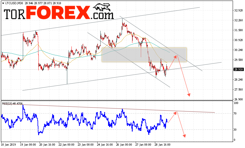 В пользу снижения котировок LTC/USD выступит тест нисходящей линии тренда на индикаторе относительной силы. А также отскок от верхней границы нисходящего канала. Отменой варианта падения станет сильный рост и пробой области 30.95. Это укажет на пробой сопротивления и продолжения роста курса криптовалюты. С пробоем нижней границы канала и закрытием котировок ниже уровня 27.50 стоит ожидать подтверждения развития нисходящей тенденции по Litecoin.